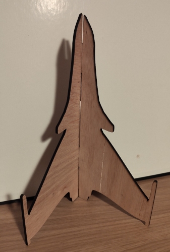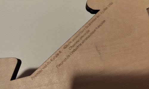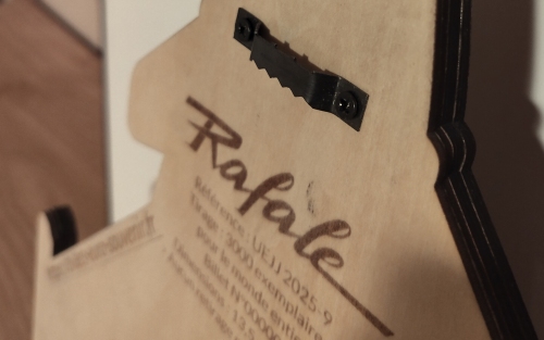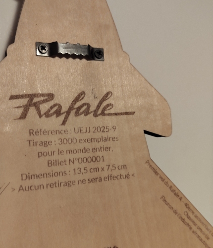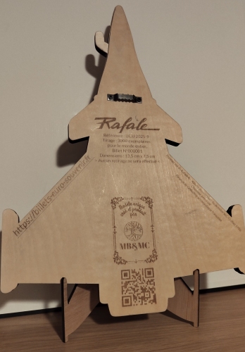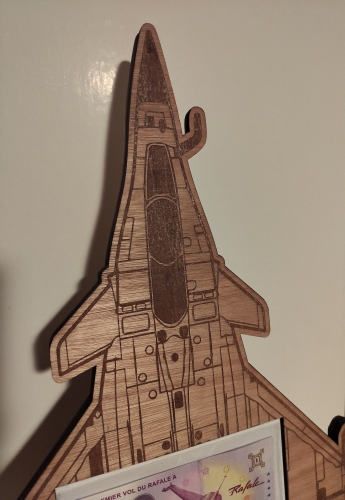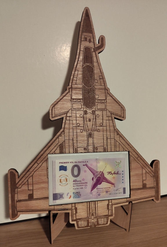 Après plusieurs échanges entre notre Association de Collectionneurs et les responsables de MB&MC, le choix s’est porté sur une définition simple mais efficace : reproduire une vue en plan du Rafale, en utilisant comme matériau de base le bois, pouvant accueillir de manière amovible le billet N°000001 du tirage, le tout pouvant être posé sur un meuble, une bibliothèque, une étagère, dans une vitrine ou bien, tout simplement, être accroché sur un mur, dans un show-room, un bureau, etc.