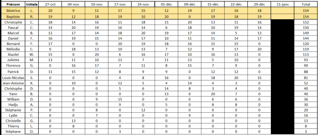 Dimanche 11 janvier à 20h, nous devrons départager Baptiste R. et Béatrice L. pour savoir QUI décrochera la première place du concours !