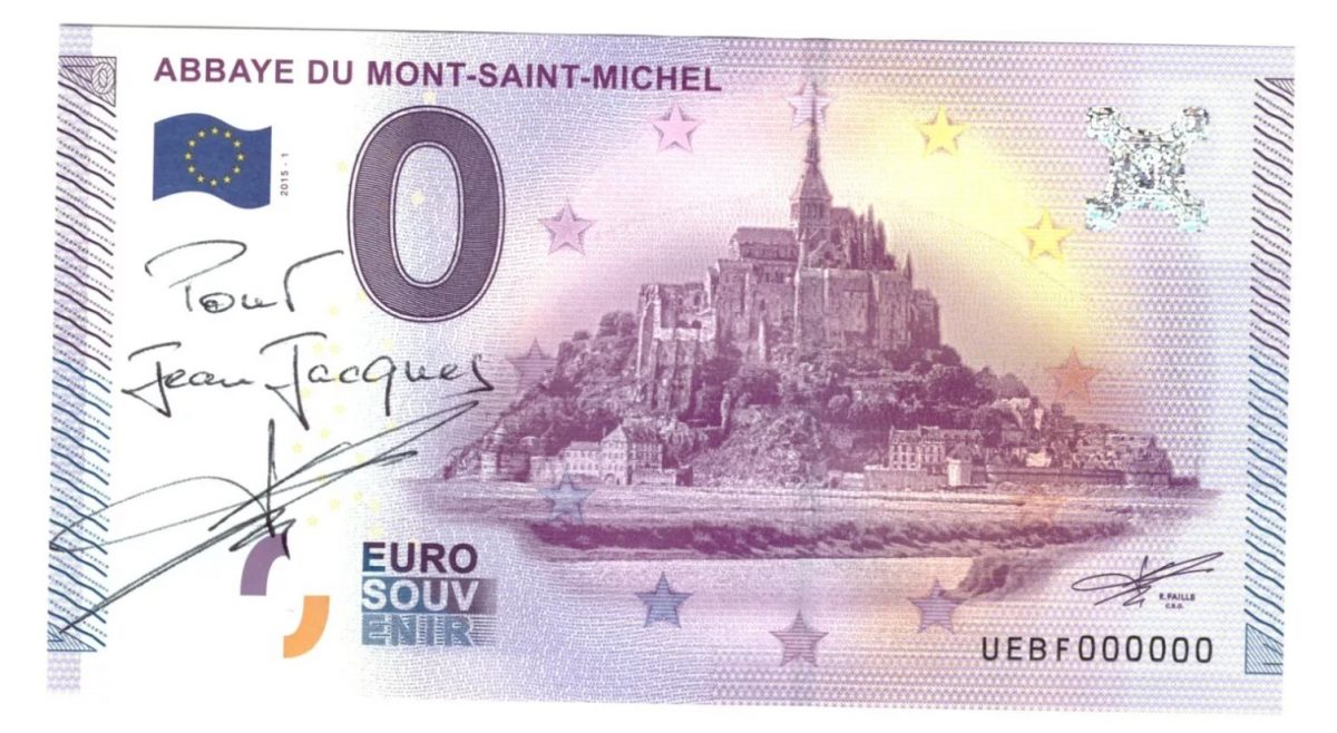 N°000000 billet dédicacé « Pour Jean-Jacques » par Richard FAILLE, créateur de la collection des billets 0€ !