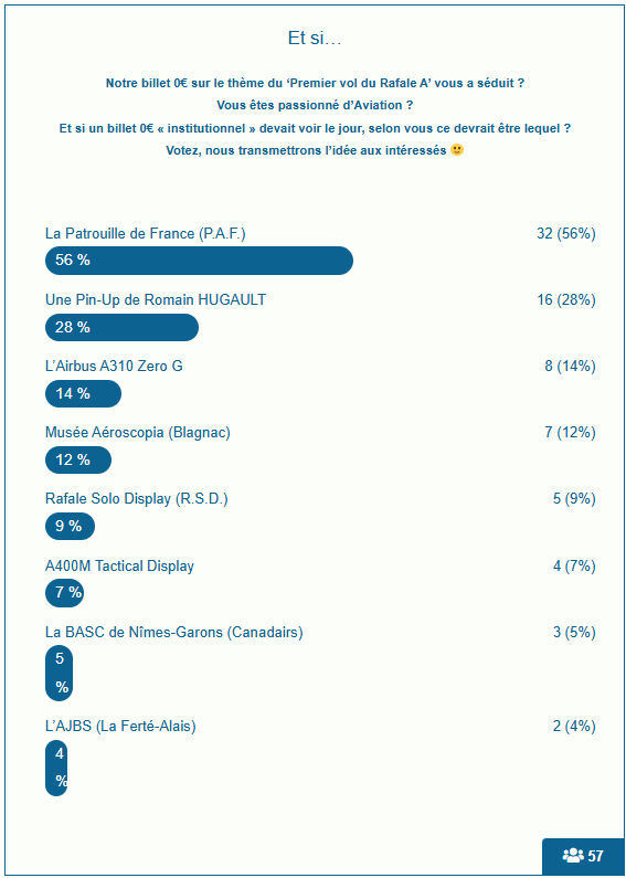 Egalement, nous avons mis en place des sondages, accessibles sur le site support du billet Zero Euro Premier Vol du Rafale A :