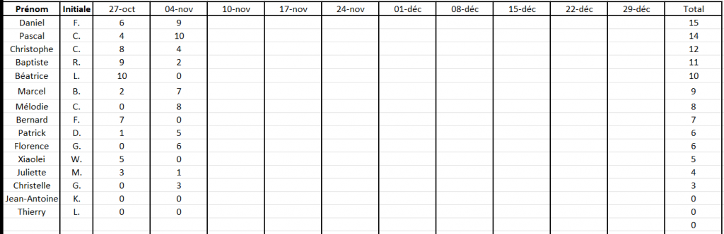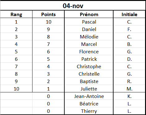 Résultats de la semaine 45 :